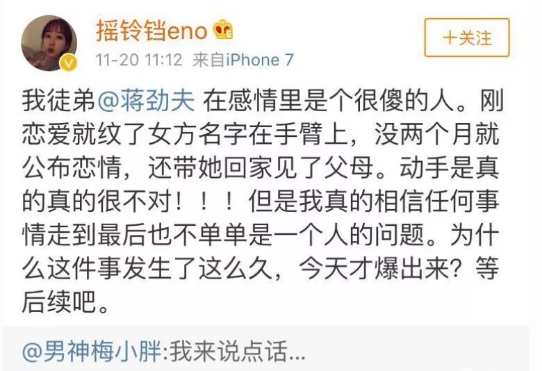 在经历了女友被扒皮“爱玩”、“劈腿”、“夜店女”却依然陷入疯狂热恋的阶段后,蒋劲夫在11月20号亲自盖章并投送了一个“家暴女友”的大瓜。