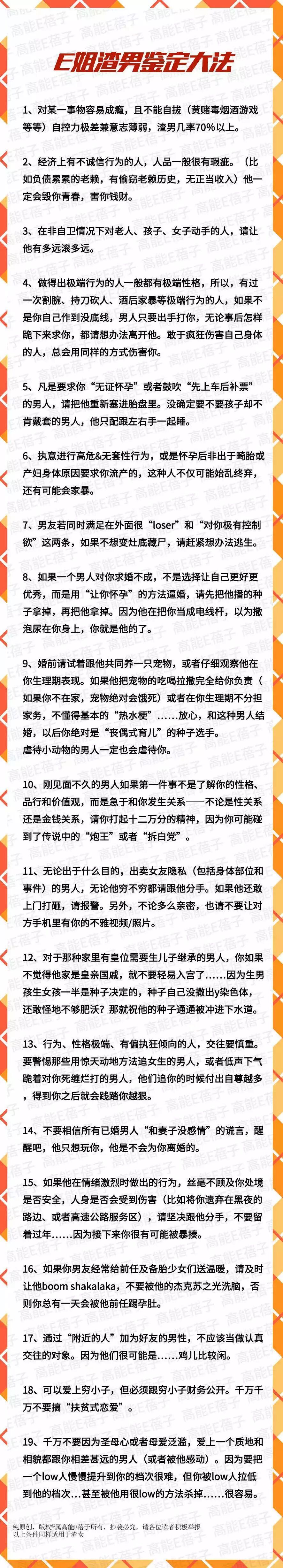 2019年已经到了,各位闺蜜们可以反复熟读E姐的渣男鉴定大法,祝大噶在新的一年里都能找到那个温柔待己、相伴余生的可人儿。