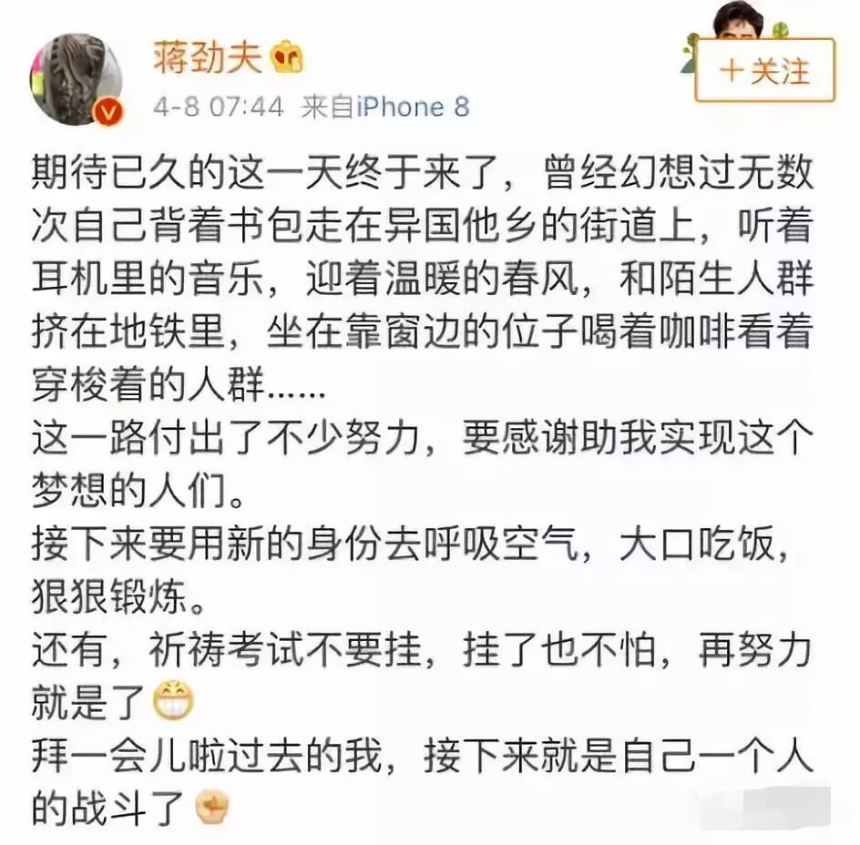 4月份他就在微博上宣布自己出国读书,准备以全新的身份开始生活的消息。