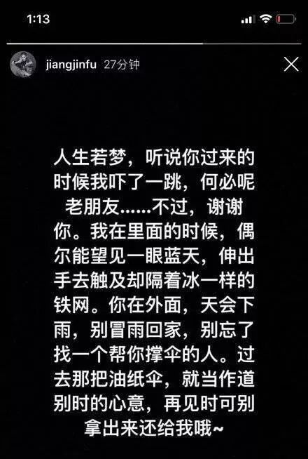 12月30日,蒋劲夫本人终于在IG上发表了一篇只有东亚劲夫才看得懂的铁窗泪。