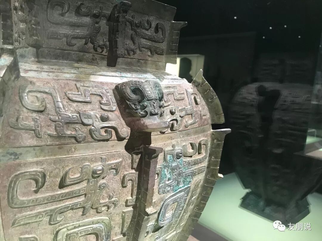 亚fu方罍(非常抱歉,输入法中未能找到fu字)非常精致华丽,其实是个酒坛子,我们可以看到它缺少盖子。这里顺便给大家讲一个湖南省博物馆皿方罍器盖合一的故事。1920年左右,湖南省的一次山洪暴发,冲出了一件体型巨大的青铜器,被一位农民发现并抱回了家,这个农民还算是比较有头脑,觉得这不是个一般的东西,应该可以卖点钱,所以找了人询价。有古董商开价四百大洋,四百大洋是个什么概念呢?在当时,一个大洋足够农民一家一个月的吃喝用度了,所以四百大洋对于这位农民来说确实是个天文数字。可他转念一想,发现随便找人一询价,就有四百大洋的高价,那是不是还会更高呢?所以农民让儿子带着器盖去村里的学校,找校长看看,这位校长很有见识,一看到东西便说:我出八百大洋。农民儿子一听,高兴坏了,马上拔腿就往家跑,可能是高兴过了头,一路走一路大喊:爹,别卖了,校长说起码值八百。这下全村人都知道了,消息立即传到了正在家里交易的古董商耳朵里,结果古董商丢下四百大洋,抱着东西就跑了。从此,这件青铜器盖体分离,后来农民觉得东西已经没了,留着盖子也没大用,便低价卖给了这位校长。