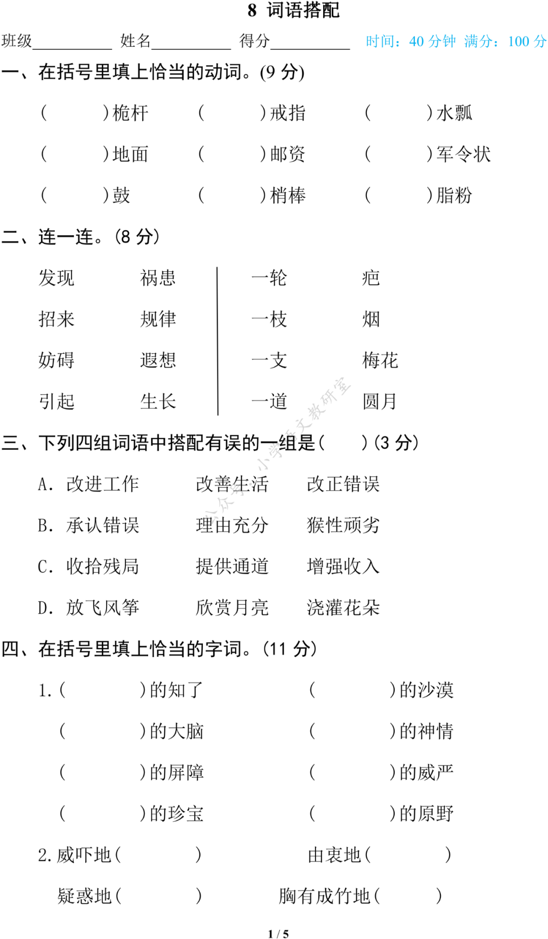 统编版语文五年级(下)期末专项训练卷8——词语搭配