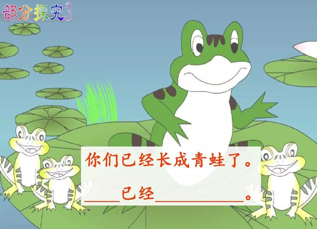 2.“小蝌蚪游过去,叫着:“妈妈,妈妈!”青蛙妈妈低头一看,笑着说:“好孩子,你们已经长成青蛙了,快跳上来吧!”他们后腿一蹬,向前一跳,蹦到了荷叶上。”