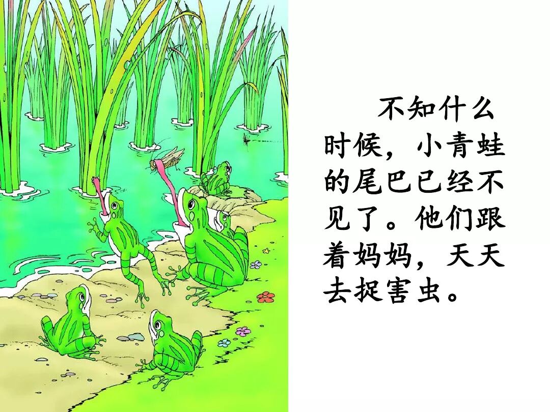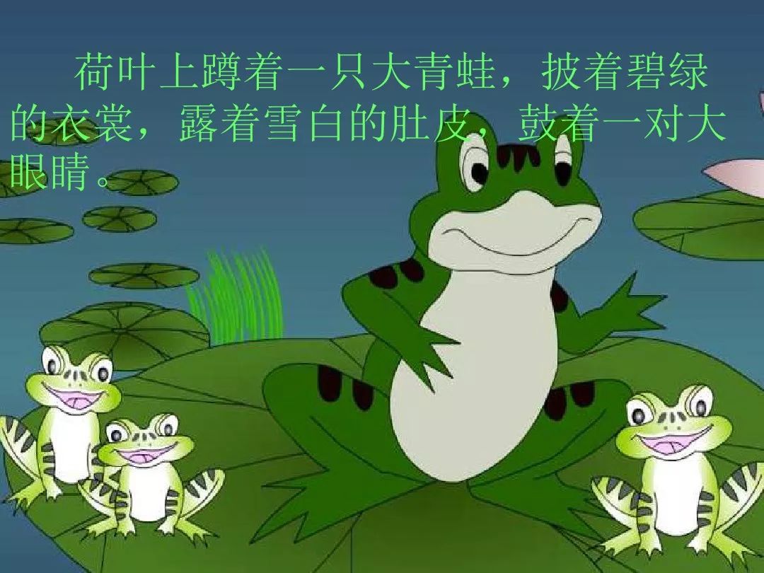 小蝌蚪游哇游,过了几天,尾巴变短了。他们游到荷花旁边,看见荷叶上蹲着一只大青蛙,披着碧绿的衣裳,露着雪白的肚皮,鼓着一对大眼睛。
