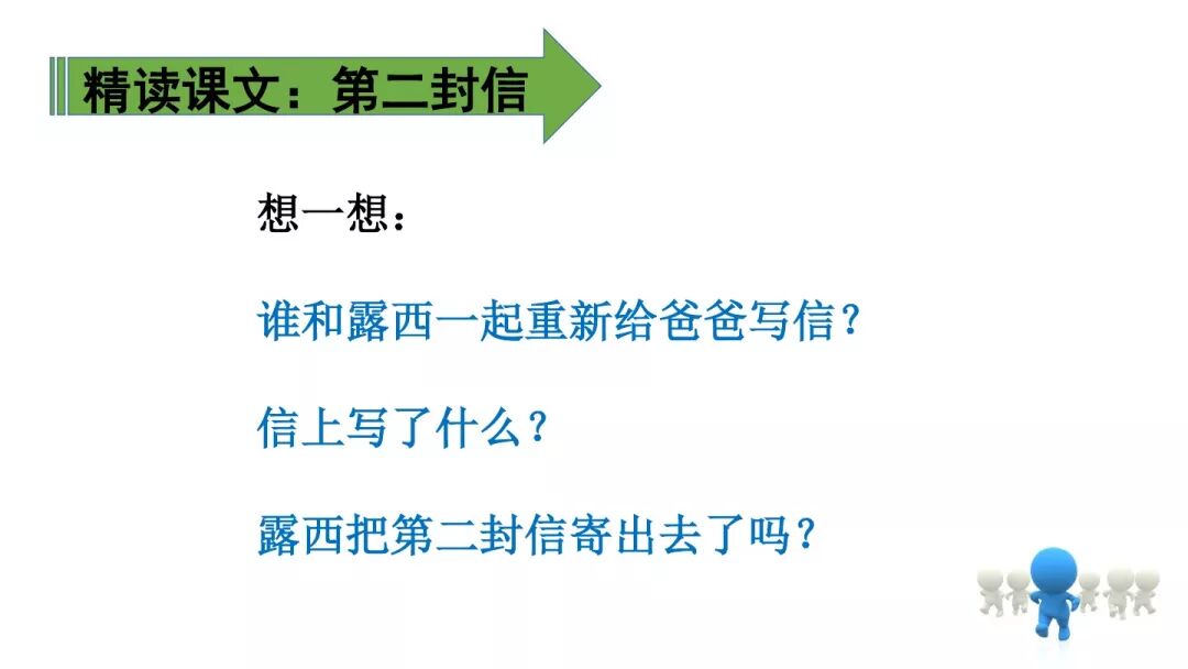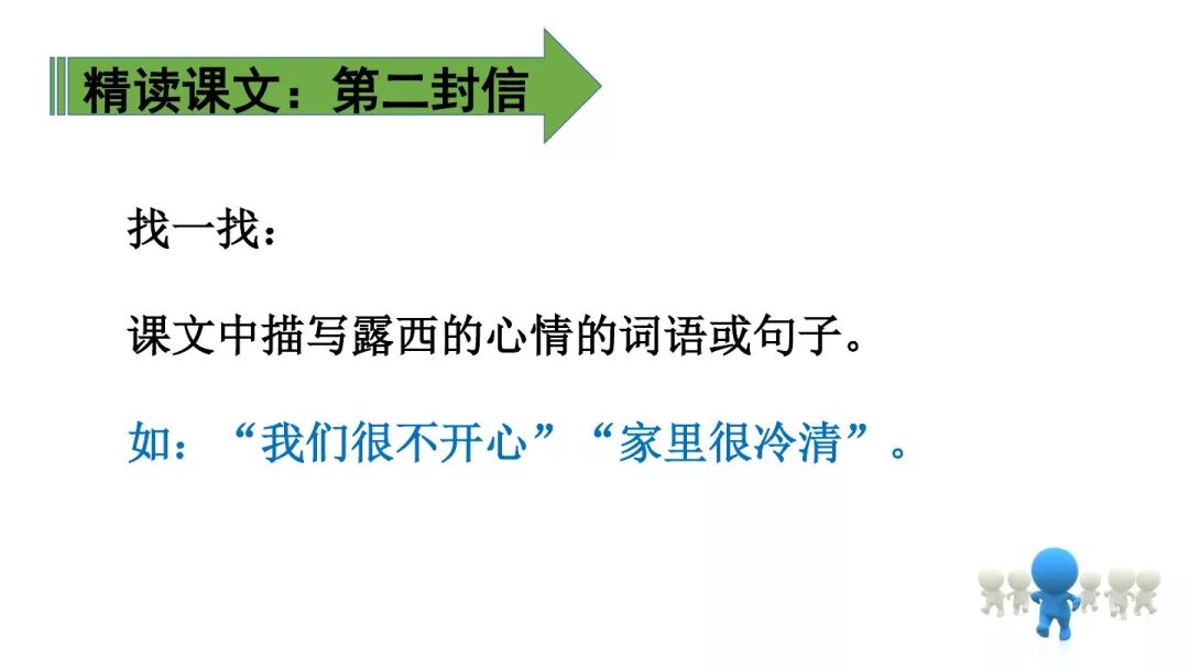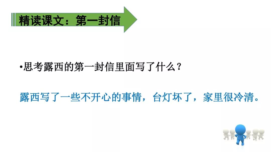 这篇课文写的是一个小女孩露西给爸爸写信的事。露西前后写了两次,第一次的内容很伤感,第二次在妈妈的感染下,露西告诉爸爸,在家生活的很好。让我们明白了露西是一个很懂事的孩子。