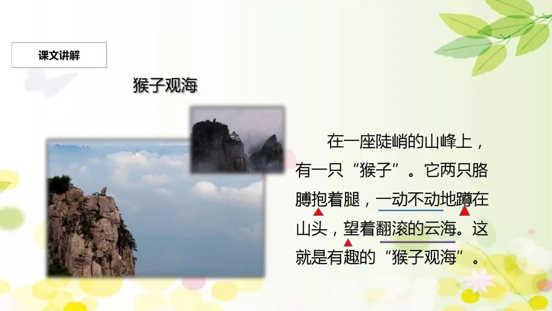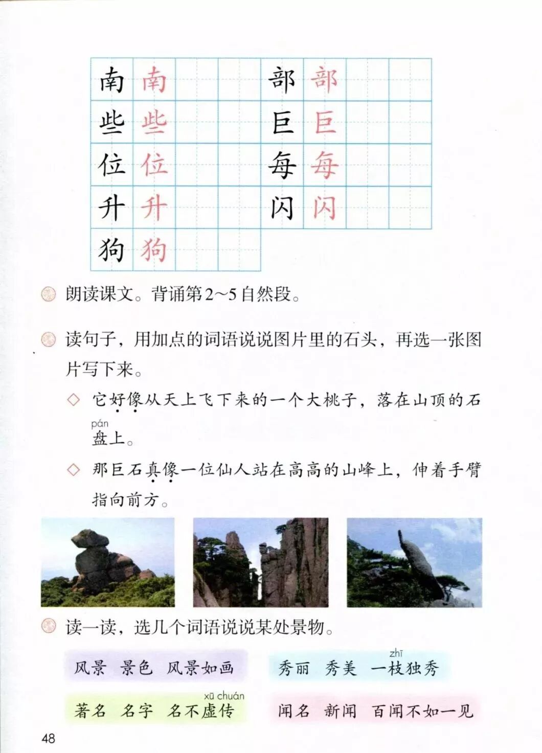 课文写到了“仙桃石”“猴子观海”“仙人指路”“金鸡叫天都”“天狗望月”“狮子抢球”“仙女弹琴”这几种奇石。