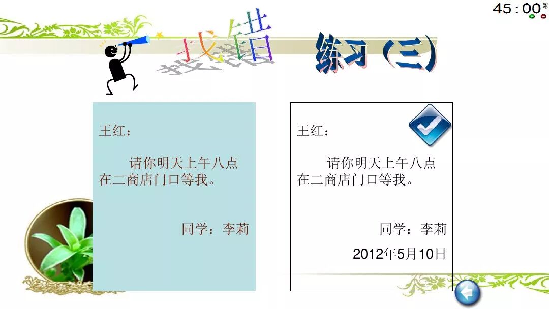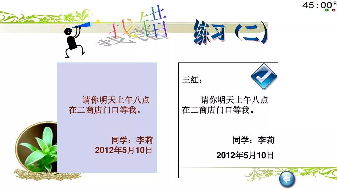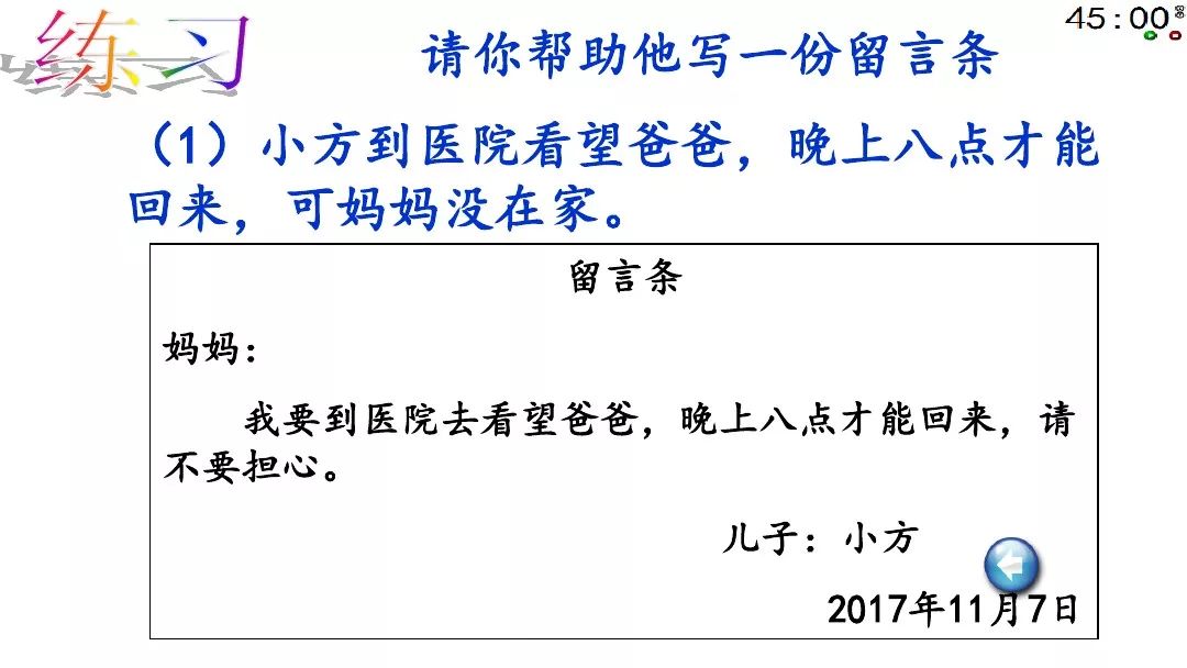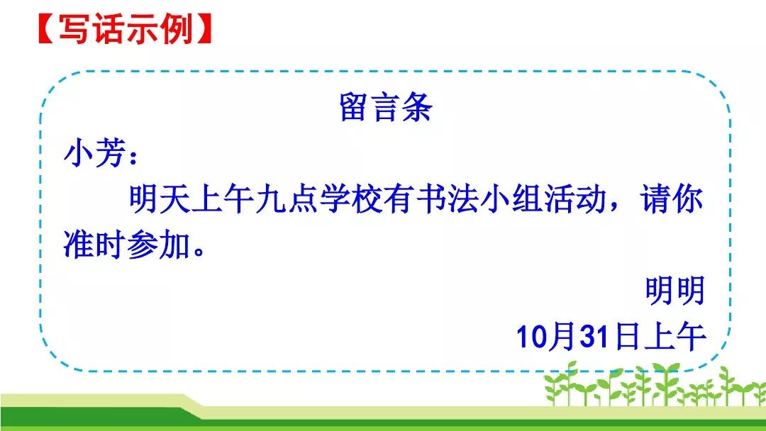 题目中常常是叙述一件事,写留言条时,不能直接照搬叙述中的人称代词。