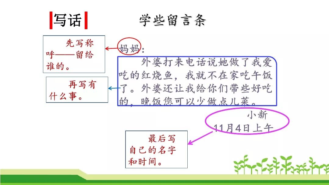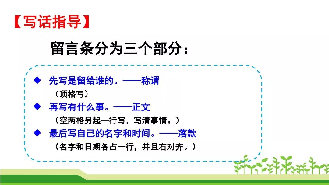 留言条分四部分:称呼、正文、署名和日期。