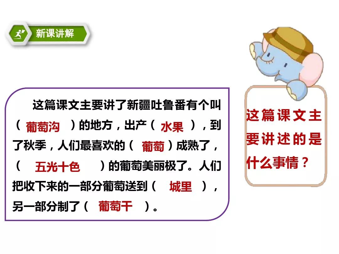 本文通过介绍葡萄沟盛产的葡萄的颜色、味道及制作葡萄干的过程,形象生动地说明了葡萄沟是个好地方,表达了作者对葡萄沟的赞美之情。