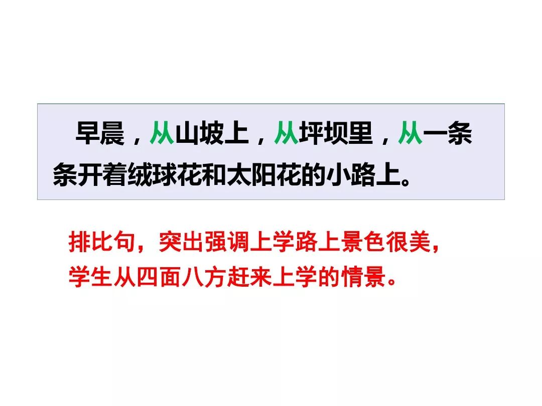 这句话告诉我们这些来自不同民族的小朋友,早早地起床,迎着朝阳,踩着露珠,高高兴兴地朝着一个共同一个地方──学校走去。这句话描绘出众多的学生由远及近汇集而来的壮观景象了。