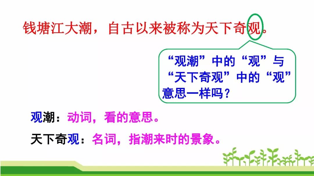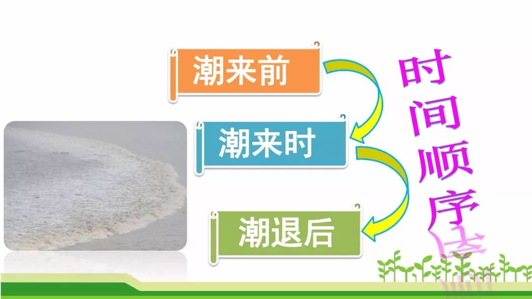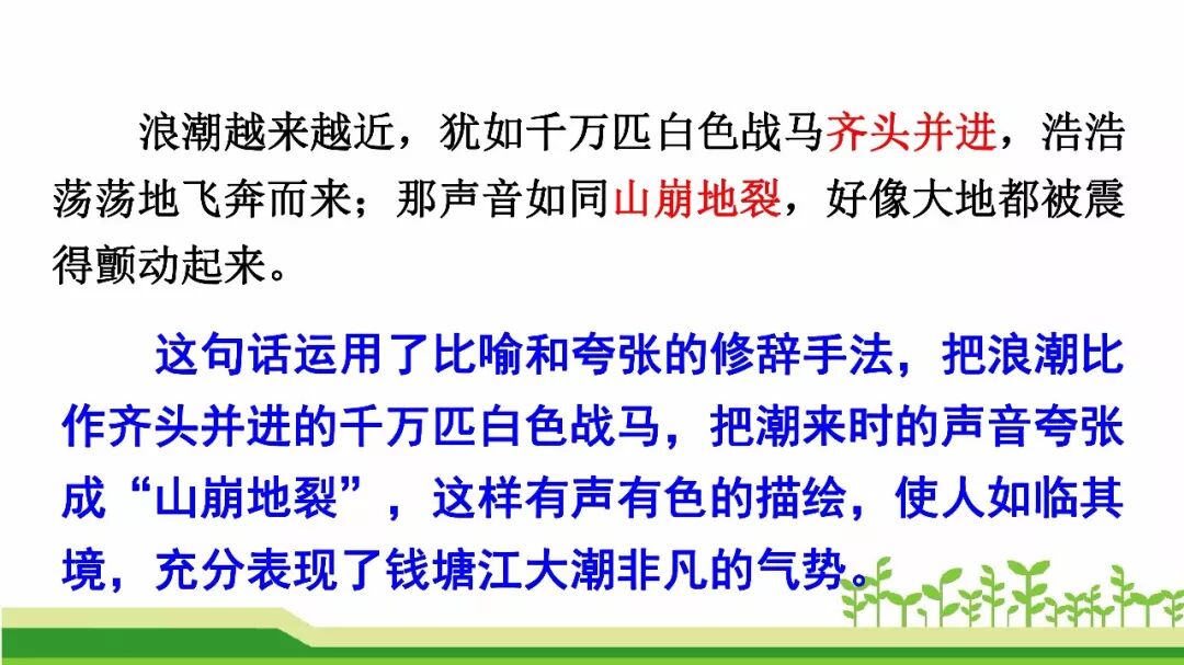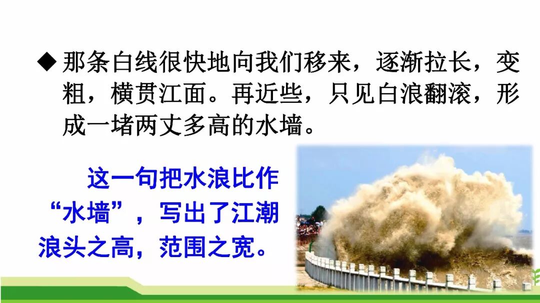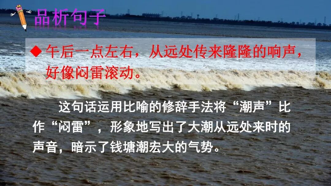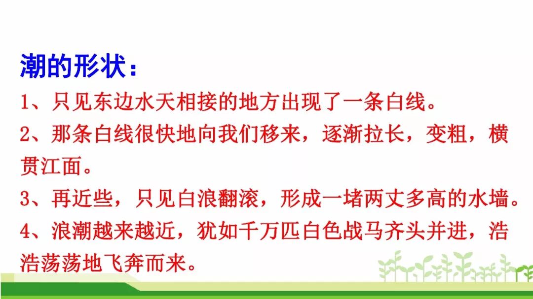 本文记叙了一次观潮的盛况。作者用生动的语言,丰富的想象,细腻的笔触,描写了钱塘江大潮由远而近、奔腾西去的全过程,写出了大潮的雄伟壮观,表达了对钱塘江大潮奇观的惊叹与热爱。课文按照“潮来之前”“潮来之时”“潮退之后”的时间顺序记叙的,重点描写了潮来之时潮水的壮观景象;从声音和样子两方面写出了潮水的宏伟气势。