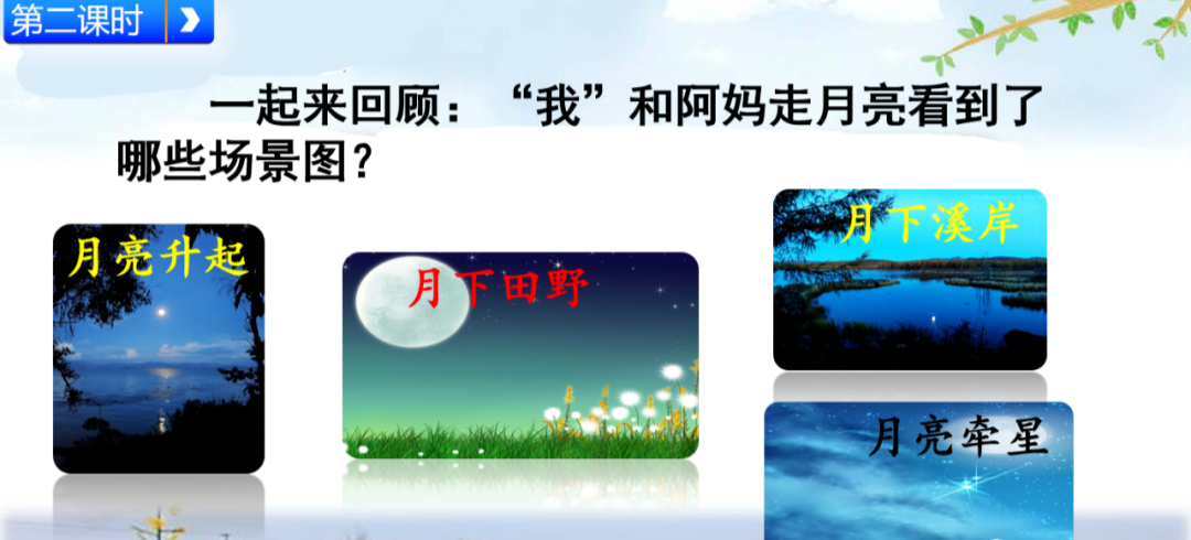 第一部分(第1-3自然段):写月亮升起,“我”和阿妈在洒满月光的小路上走月亮。