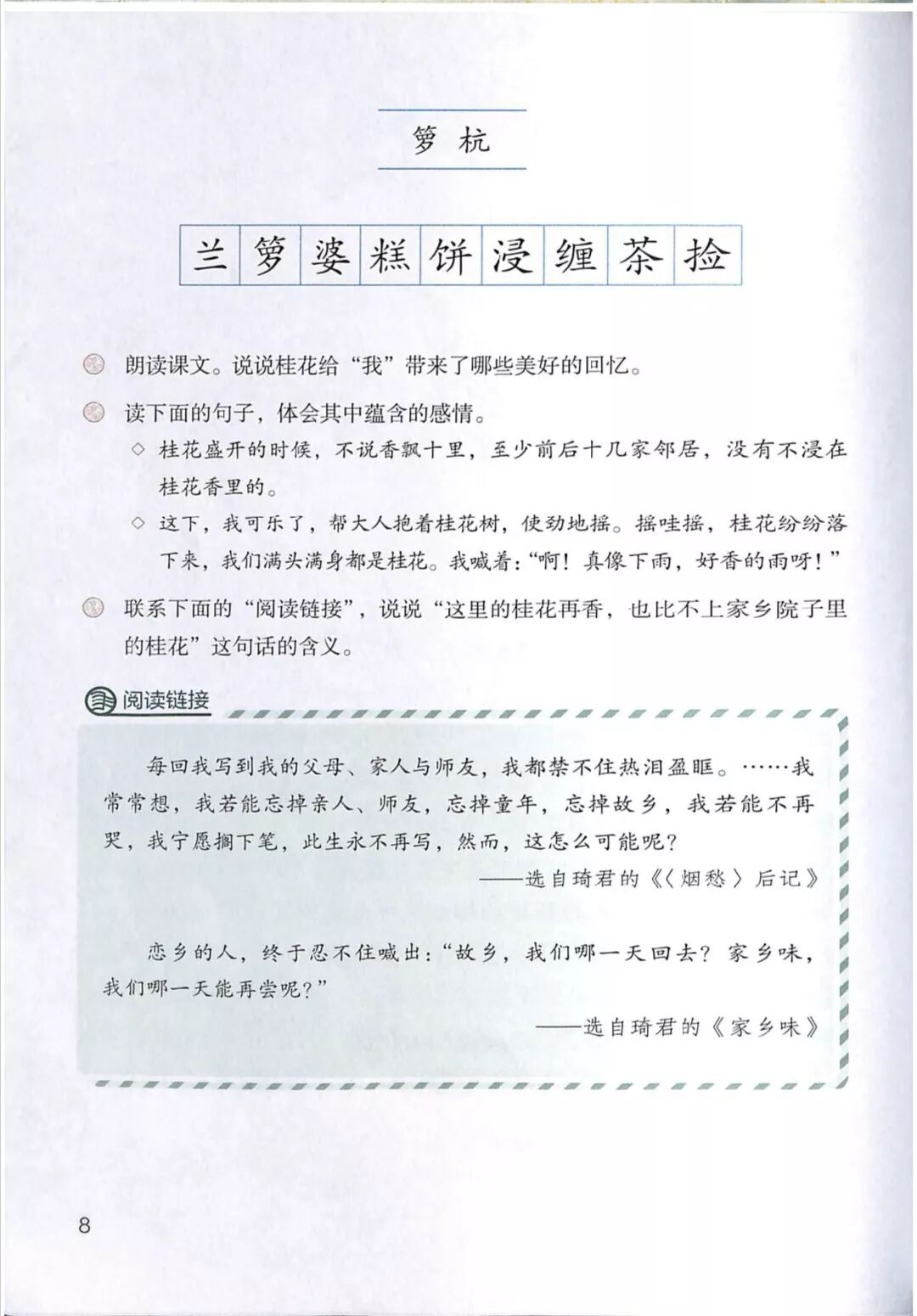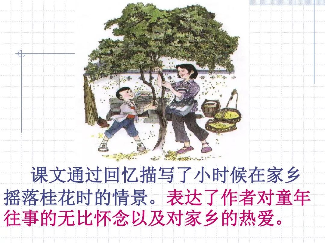 课文描写了“我”儿时在家乡帮大人摇桂花的美好回忆。表达了对儿时往事的无比怀念之情,抒发了对家乡无比热爱的思想感情。