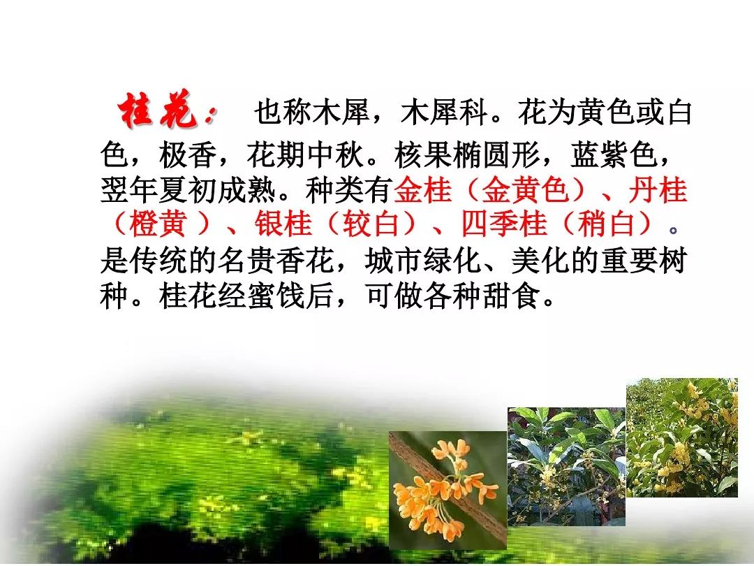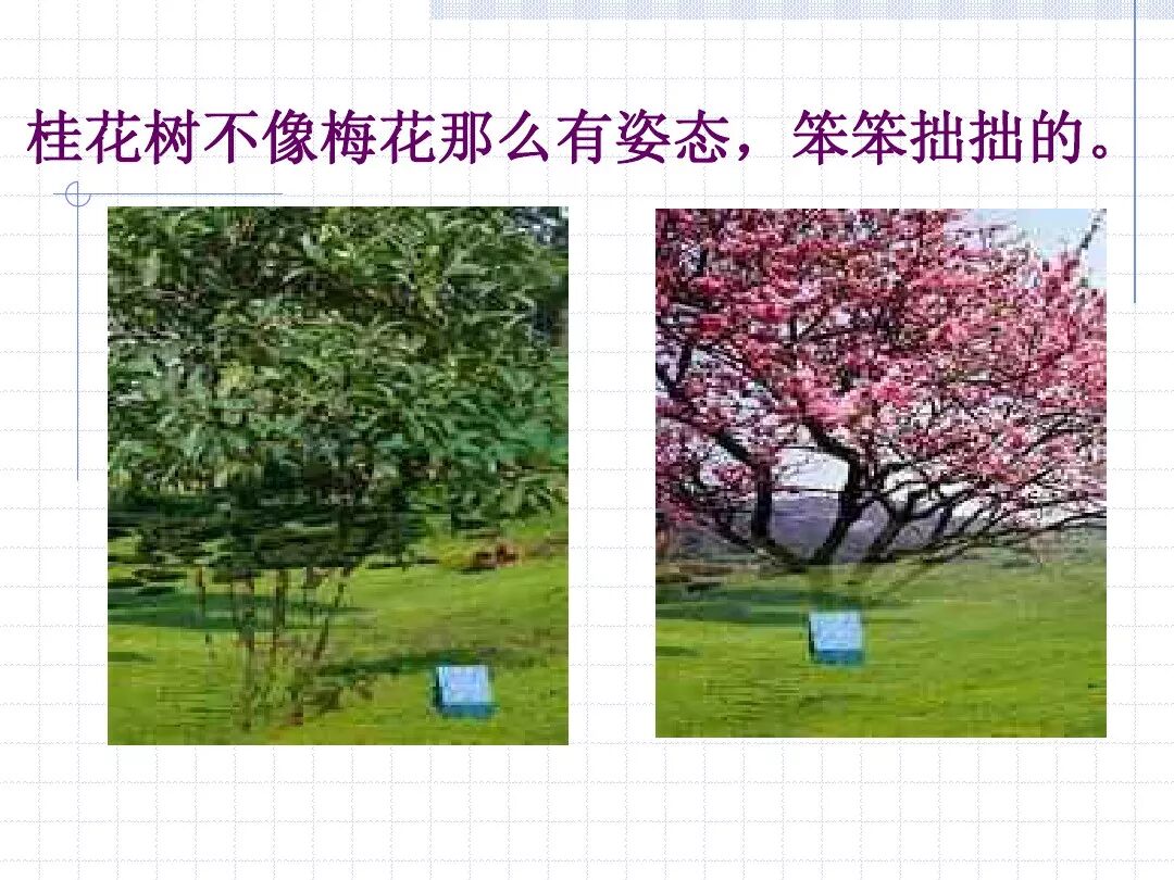 1.桂花树的样子笨笨的,不像梅树那样有姿态。不开花时,只见到满树的叶子;开花时,仔细地在树丛里寻找,才能看到那些小花。可是桂花的香气,太迷人了。