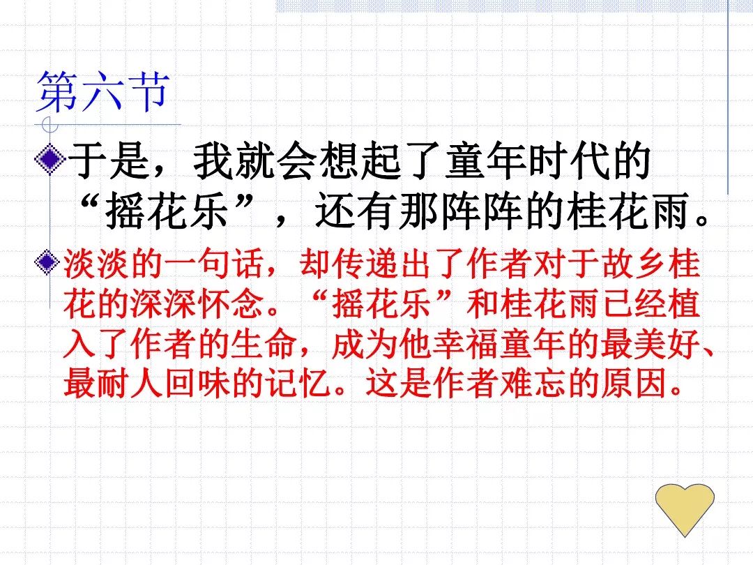 家乡的桂花,是跟作者童年的快乐连在一起的,那种“摇花乐”和桂花雨已植入了她的生命,成为她幸福童年的最美好、最耐人回味的记忆。