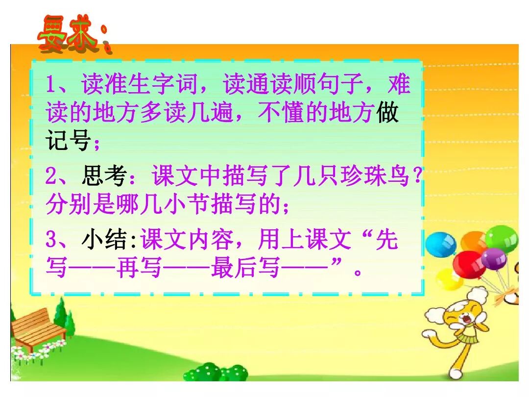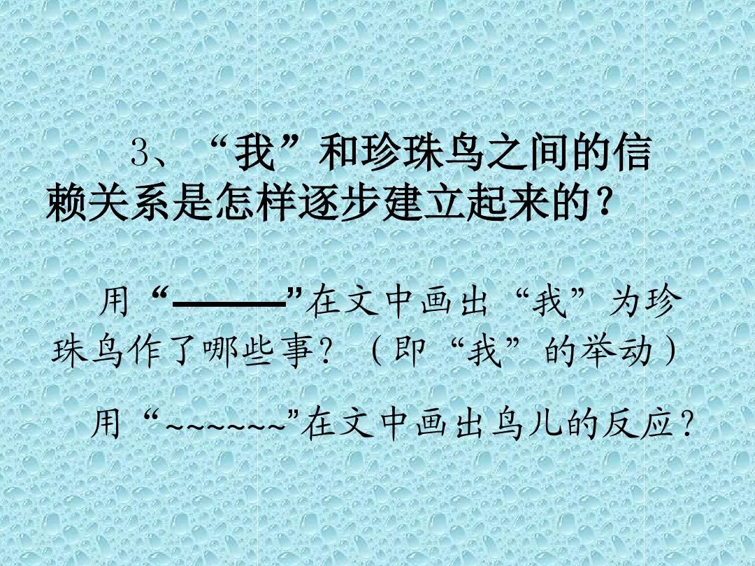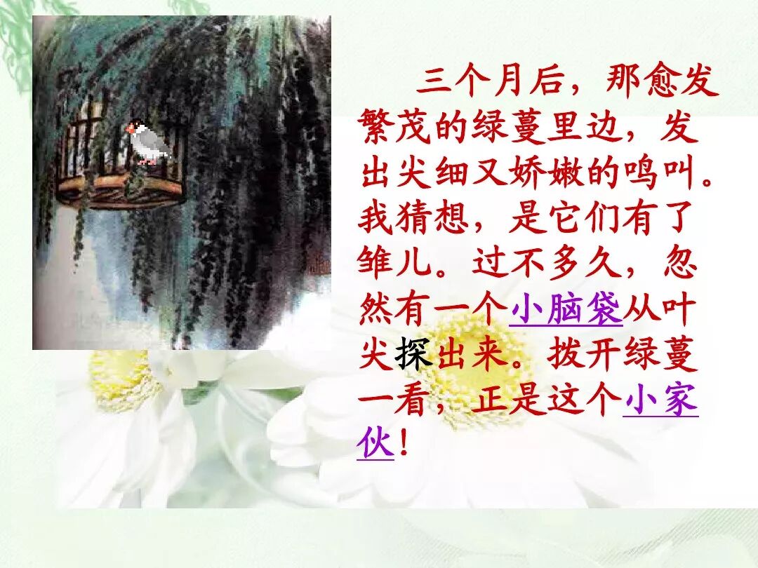 第二段(2-12):写可爱的雏鸟出生了,在“我的呵护下健康成长,“我”取得了小珍珠鸟的信赖,与它建立了亲密无间的友谊。