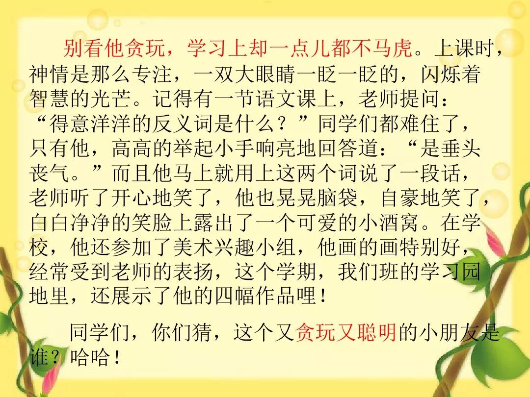 选择一个同学,用几句话或一段话写一写他。不能在文中出现他的名字,但是要让别人读了你写的内容,能猜出你写的是谁。