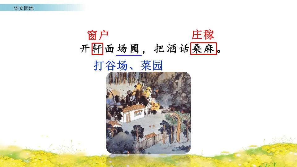 译文:老朋友预备丰盛的饭菜,邀请我到他好客的农家。翠绿的树林围绕着村落,苍青的山峦在城外横卧。推开窗户面对谷场菜园,手举酒杯闲谈庄稼情况。等到九九重阳节到来时,再请君来这里观赏菊花