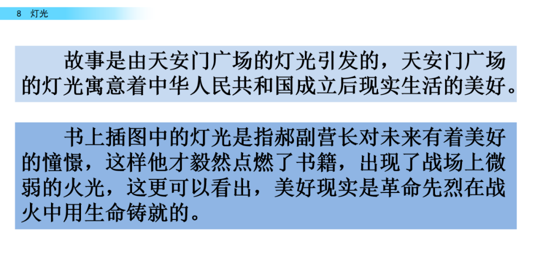 本文通过一个关于灯光的故事,歌颂了革命先烈的献身精神。全文开头和结尾写的是现在,中间的主体部分是对往事的回忆。开头由天安门广场的灯光写起,继而引起“我对往事的回忆,结尾照应开头。从“我”在璀璨的华灯下回忆牺牲的战友,可以体会到“我”对美好生活的赞美和不忘过去、要好好珍惜今天幸福生活的愿望。