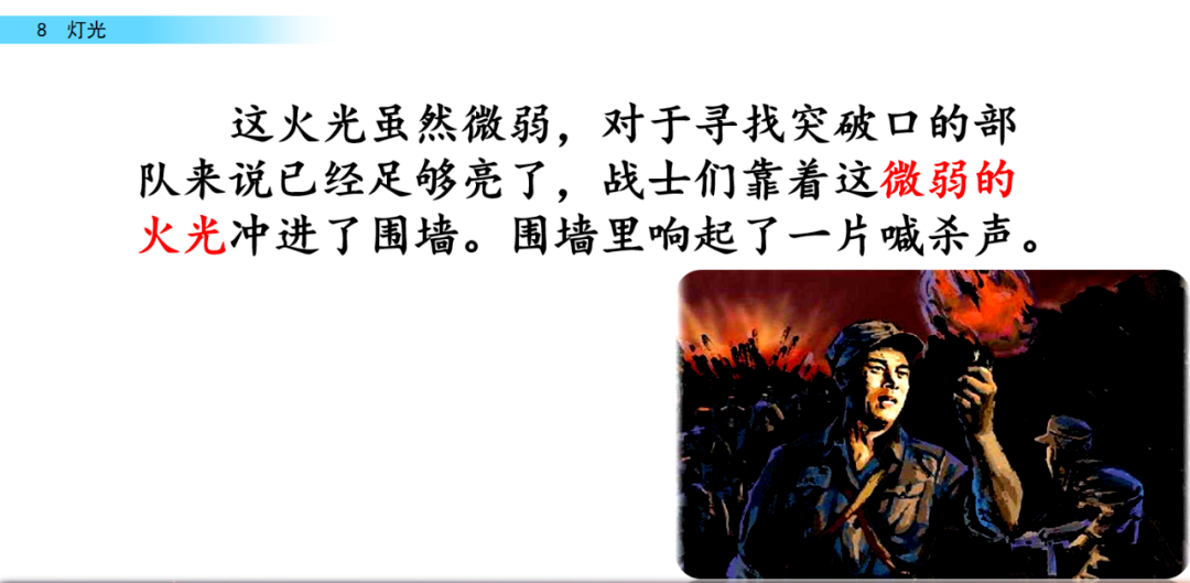 后来才知道,在这千钧一发的时刻,是郝副营长划着火柴,点燃了那本书,举得高高的,为后续部队照亮了前进的路。可是,火光暴露了他自己,他被敌人的机枪打中了。