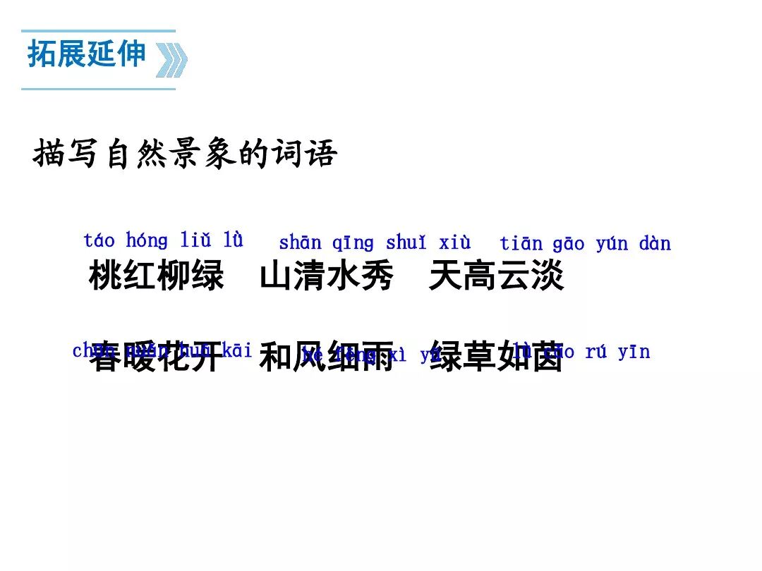 《对韵歌》共3句。第一、二两句以单字对的形式,包罗自然现象“云、雨、雪、风”和动植物“花、树、鸟、虫”。第三句是双字对的形式,呈现山清水秀和柳绿桃红的美丽景色。整篇课文就是一幅美丽的画卷。