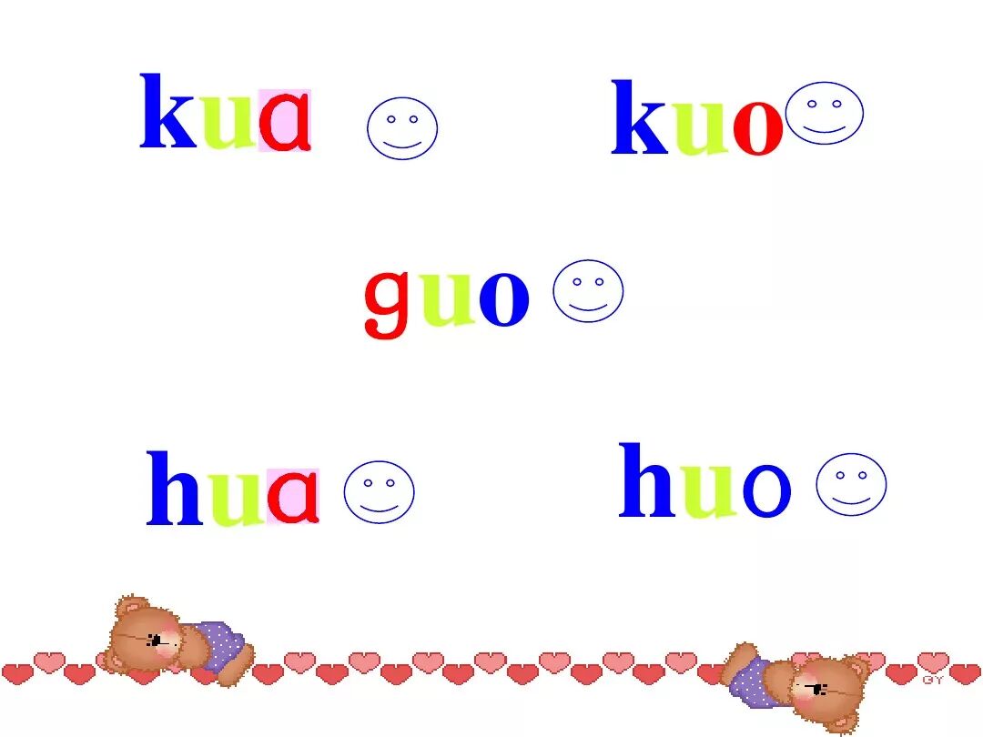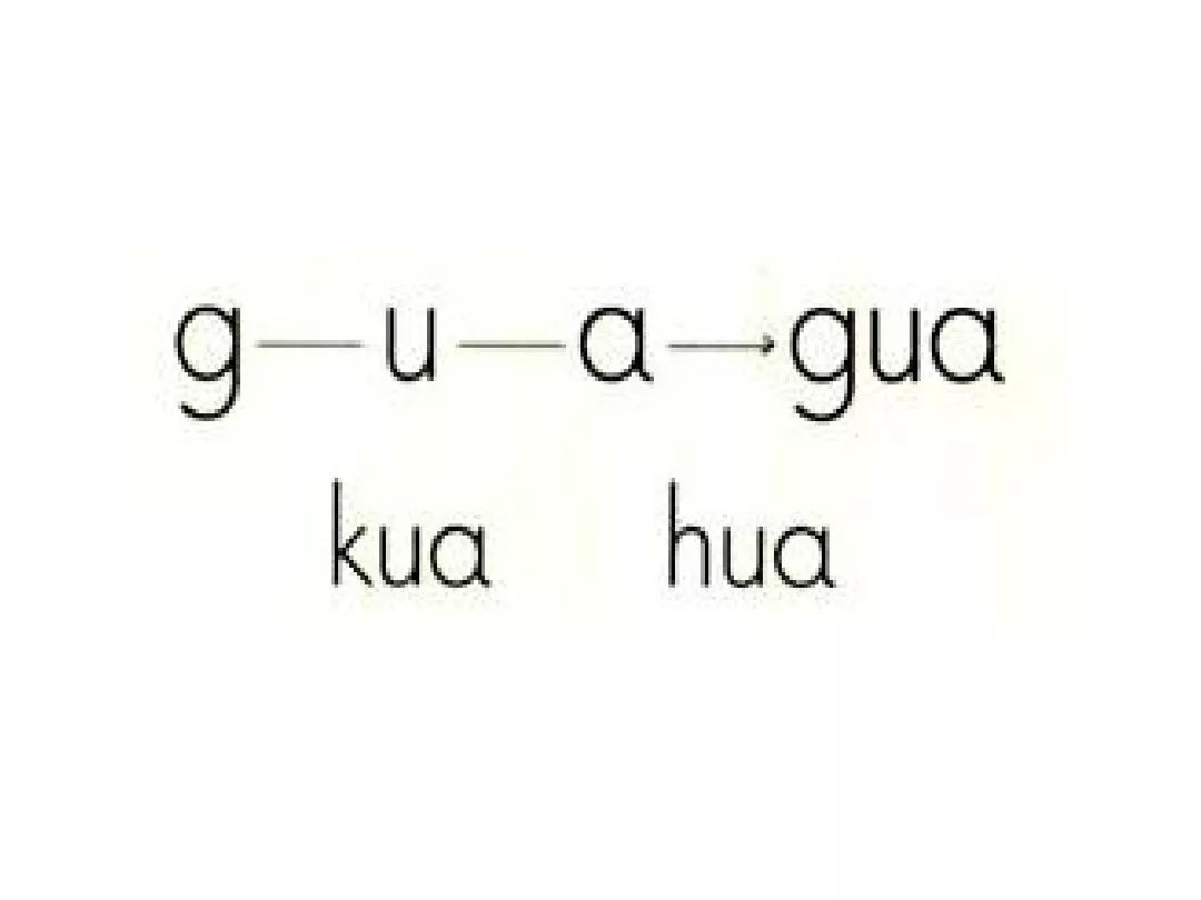 三拼音节:如“guā”,拼读时。g要读得轻一些,u要读得快,a要读得响亮些。