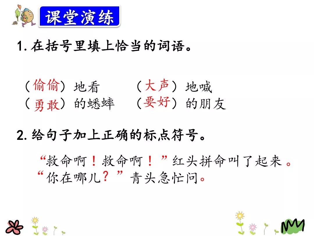 2.红头向周围看了看,悄悄地躲在一个草堆里不作声了。