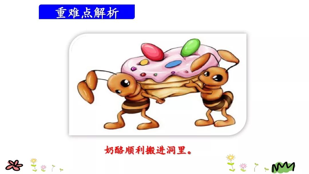 蚂蚁队长自己抬不动,需要七八只小蚂蚁帮忙,这块奶酪可真大啊!“只好”一词用得非常准确,既说明了蚂蚁队长的无可奈何,也强调了奶酪的大。