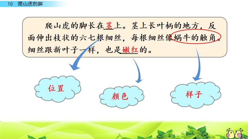 六、1、脚 茎 叶柄 枝状 蜗牛 嫩红 2、位置 形状 颜色 4、每根细丝像蜗牛的触角。比喻句好在能较生动、形象地说出爬山虎脚的样子。5、因为作者认真观察、留心事物。