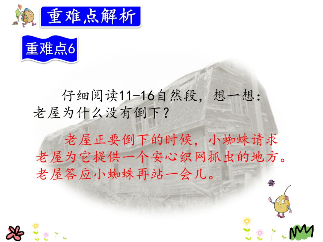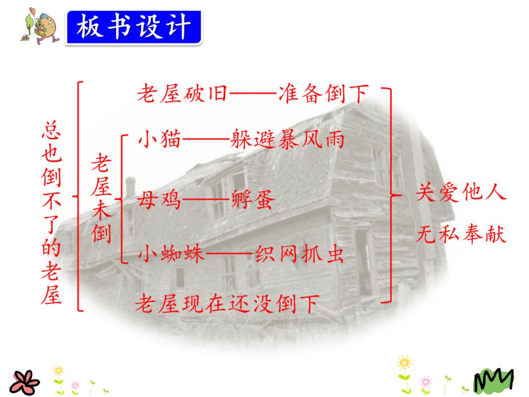 二、主题:课文写老屋想倒下,但小猫、老母鸡和小蜘蛛分别请求它帮忙,老屋都一一答应了,最后小蜘蛛一边补网,一边给它讲故事,直到现在老屋也没有倒下的故事。赞扬了老屋助人为乐、心为别人着想的品质。