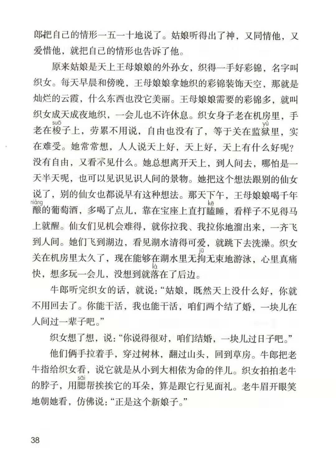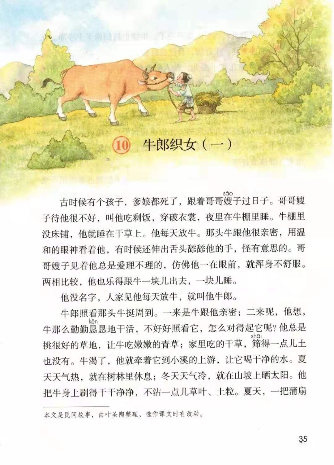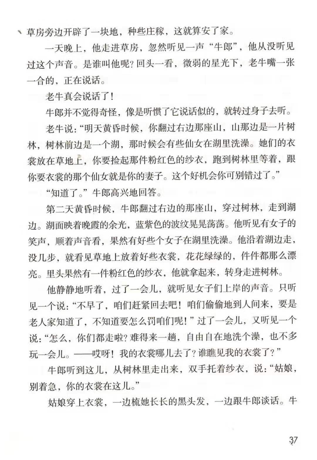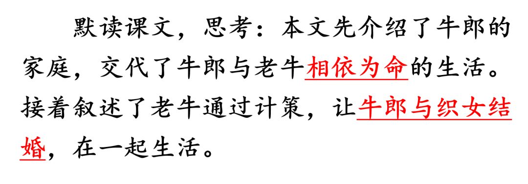答:文章主要讲述了牛郎从小生活孤苦,和一头老牛相依为命,后来在老牛的帮助下,与织女相识、结婚的故事。