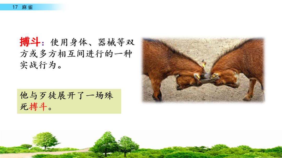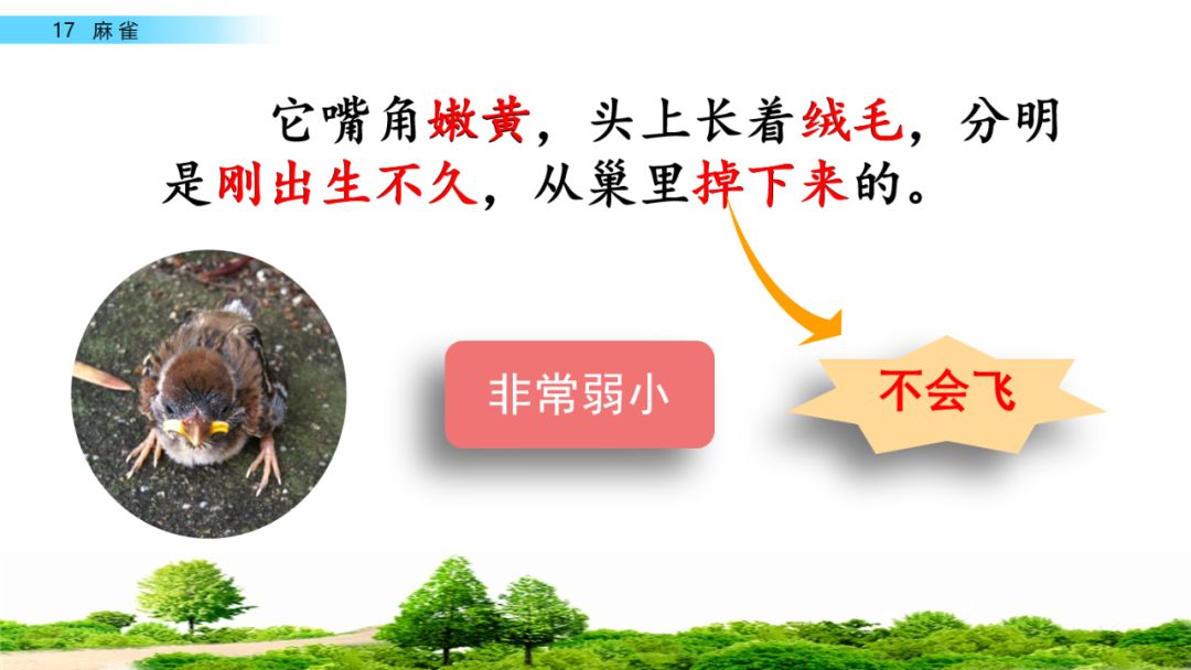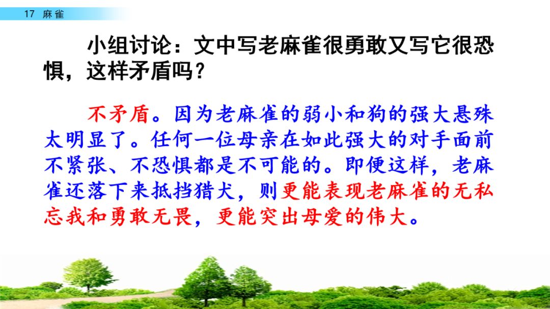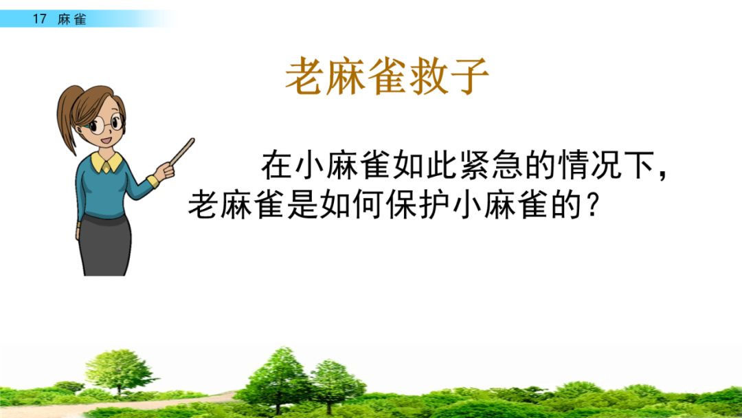 老麻雀用自己的身躯掩护着小麻雀,想拯救自己的幼儿。可是因为紧张,它浑身发抖了,发出嘶哑的声音。它呆立着不动,准备着一场搏斗。在它看来,猎狗是个庞大的怪物。可是它不能安然地站在高高的没有危险的树枝上,一种强大的力量使它飞了下来。