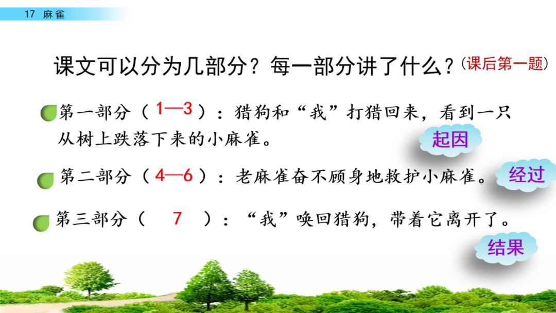 答:起因:猎狗发现一只从巢里掉下来的小麻雀。