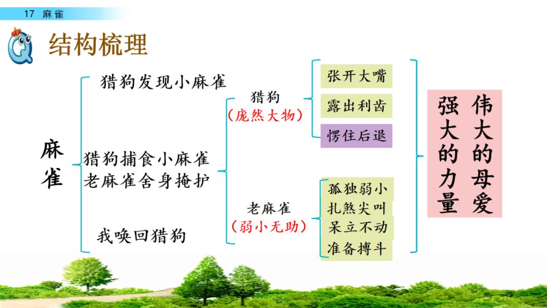 本文讲述了一只老麻雀不顾自身安危,毅然保护小麻雀免受猎狗伤害的故事,表现了老麻雀的英勇无畏和对小麻雀伟大的母爱。