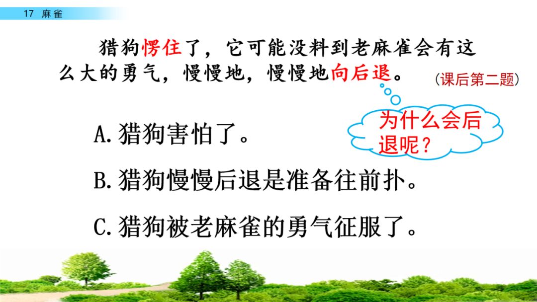 B.因为老麻雀看到了猎狗的凶恶,很害怕,所以“浑身发抖”;同时它希望通/2.叫声来换来其它的帮助,所以“发出嘶哑的声音”。
