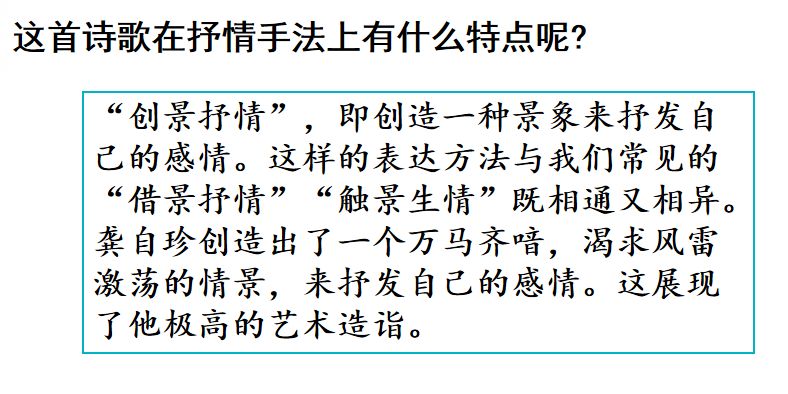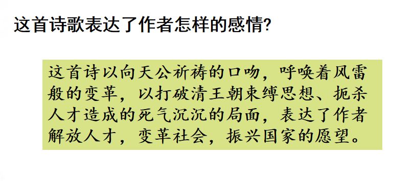① 前两句用了两个比喻,写出了诗人对当时国家形势的看法。“风雷”比喻社会变革,“万马齐喑”比喻当时举国上下死气沉沉的局面。