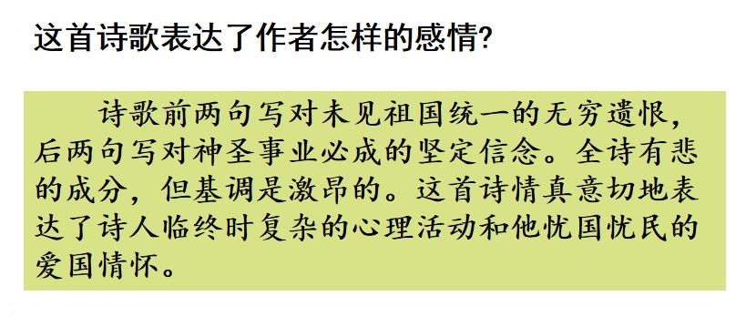 ② 诗人以热切期望的语气表达了渴望收复失地的信念,嘱咐儿孙不要忘记把喜讯告诉自己。表明诗人虽然沉痛,但并未绝望,他坚信总有一天,宋朝的军队必定能平定中原,收复失地。