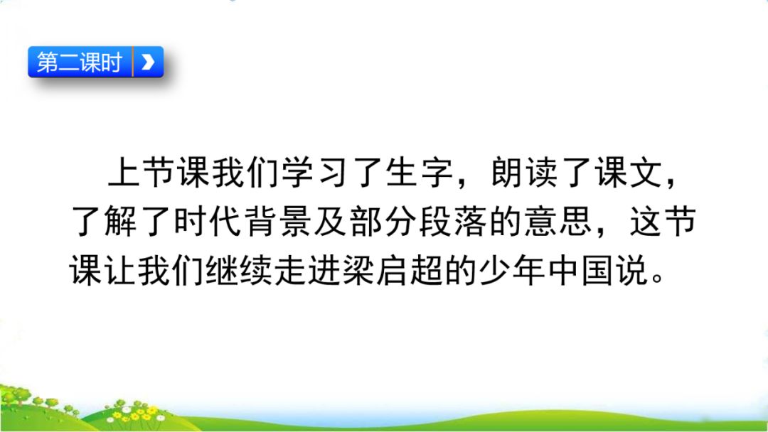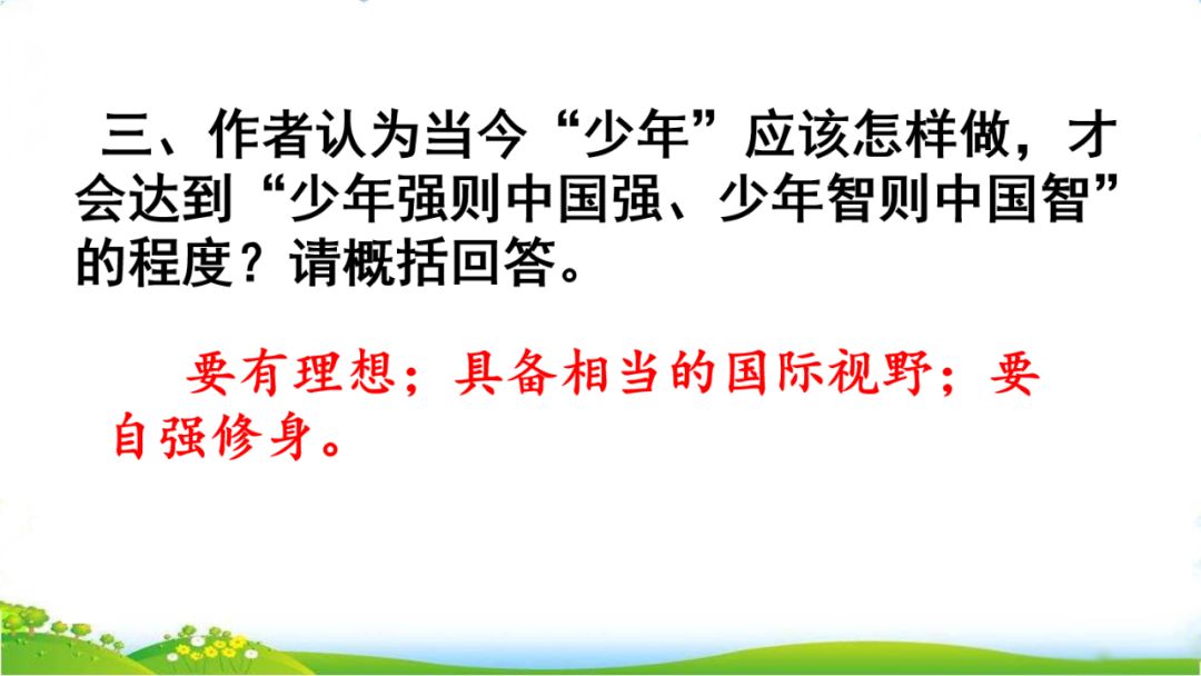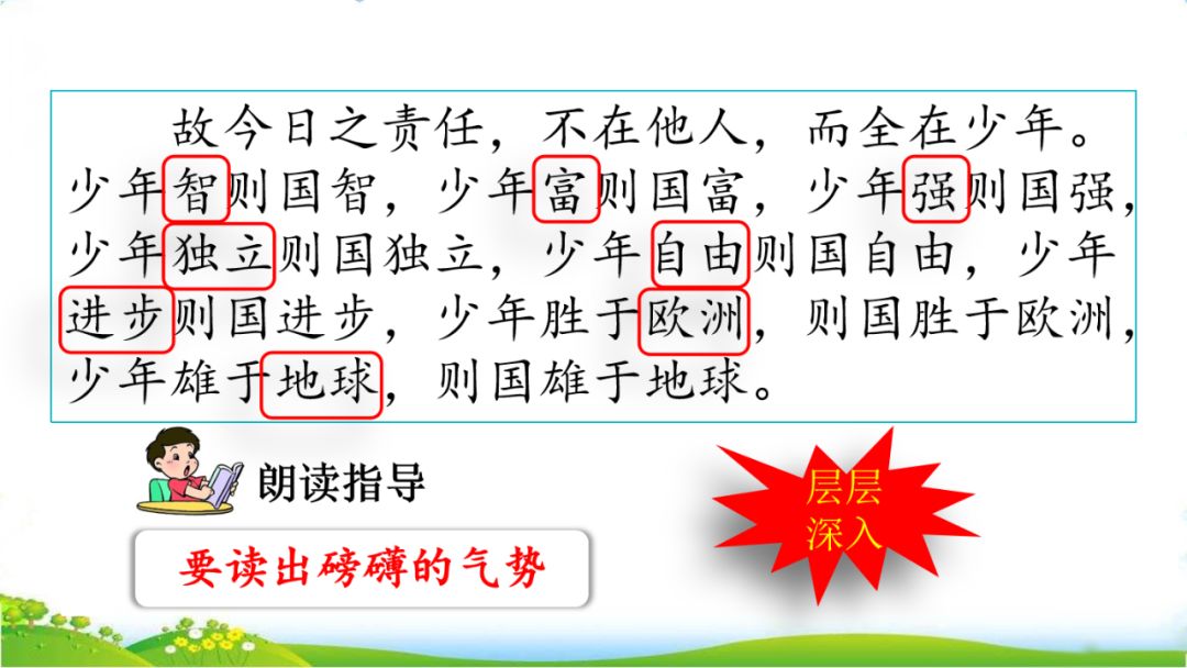 二、1. 则国智 少年富则国富 少年强则国强 少年独立则国独立 少年自由则国自由 少年进步则国进步 少年胜于欧洲 则国胜于欧洲 少年雄于地球 则国雄于地球