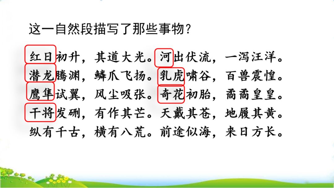 答:初升的太阳,奔腾的黄河,腾跃的蛟龙,啸鸣的乳虎,展翅试飞的鹰隼,珍奇的花蕾,刚磨好的宝剑。