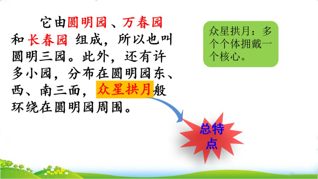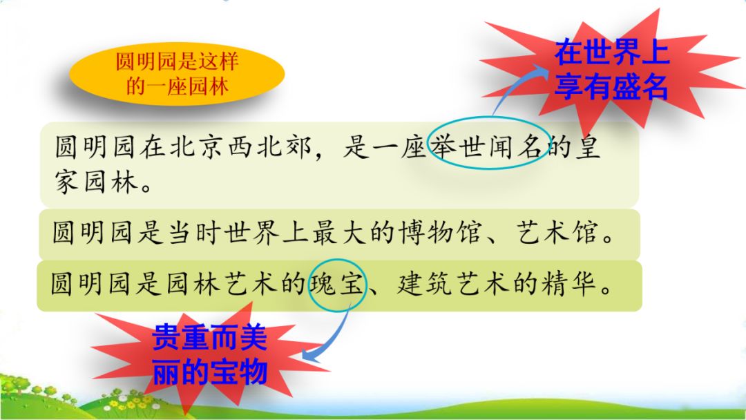 答:(1)圆明园的位置与总体布局:(2)圆明园的种种景点,突出它在园林建筑上的杰出成就:(3)圆明园内收藏的历史文物和奇珍异宝,突出它的文化艺术价值。