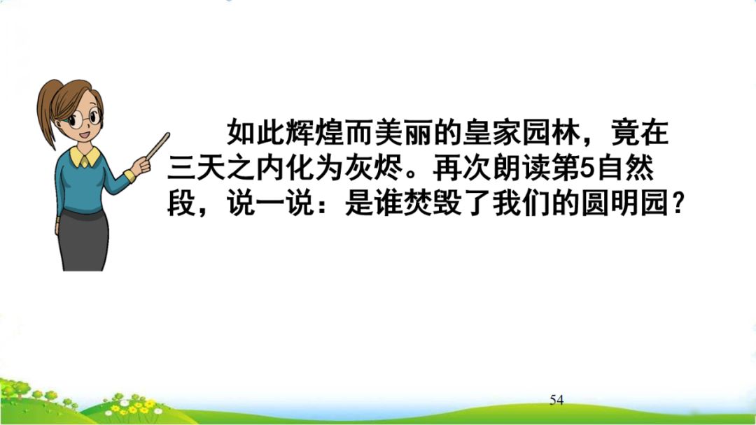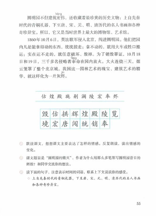 本文描述了圆明园昔日辉煌的景观和惨遭侵略者肆意践踏毁灭的经过,表达了作者对祖国灿烂文化的无限热爱和对侵略者野蛮、无耻行径的无比痛恨,激发人们不忘国耻、振兴中华的责任感和使命感。