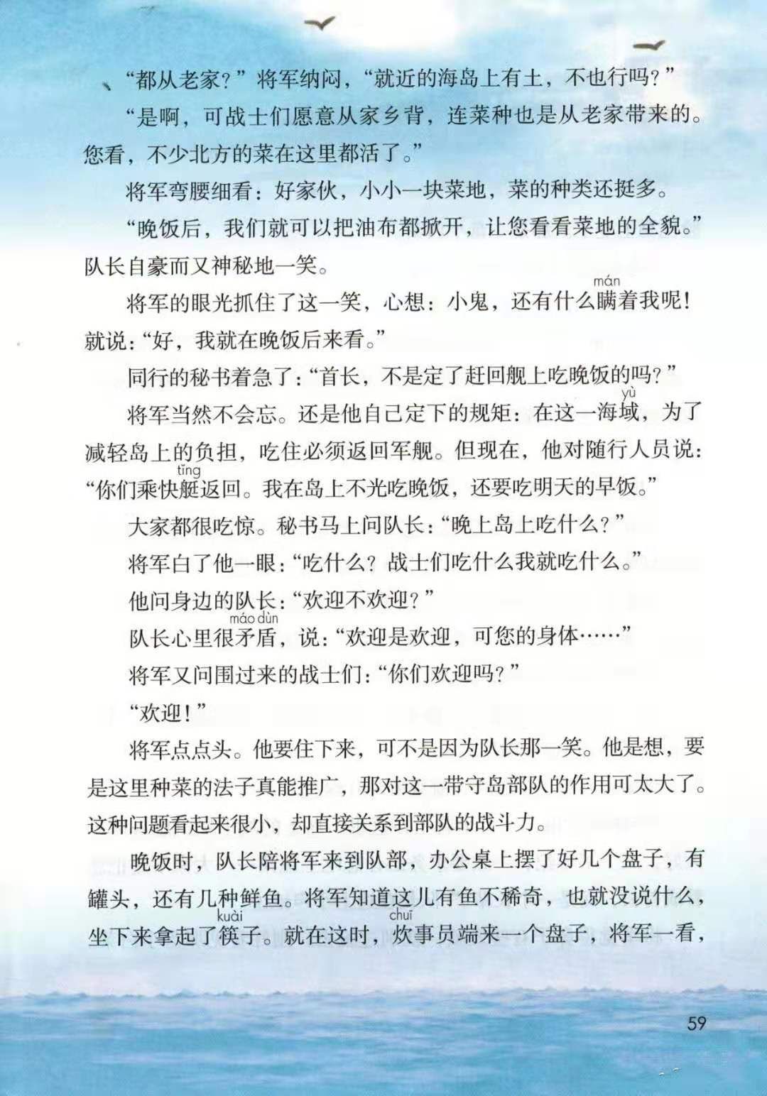 这篇课文以将军的见闻为线索,记叙了战士们在小岛上种出一大块中国地图形状的菜地的事,赞扬了海防战士们坚强乐观、不怕困难、热爱祖国的高尚情怀。