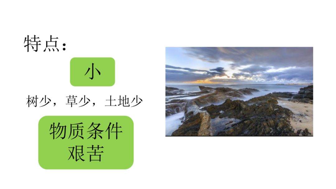 答:这个小岛的环境很艰苦。(1)小。“转一圈也用不了十分钟”。(2)环境非常恶劣。“树少,草少,土也很少”。(3)很热。“最凉快”的时候,是“二三十摄氏度”。
