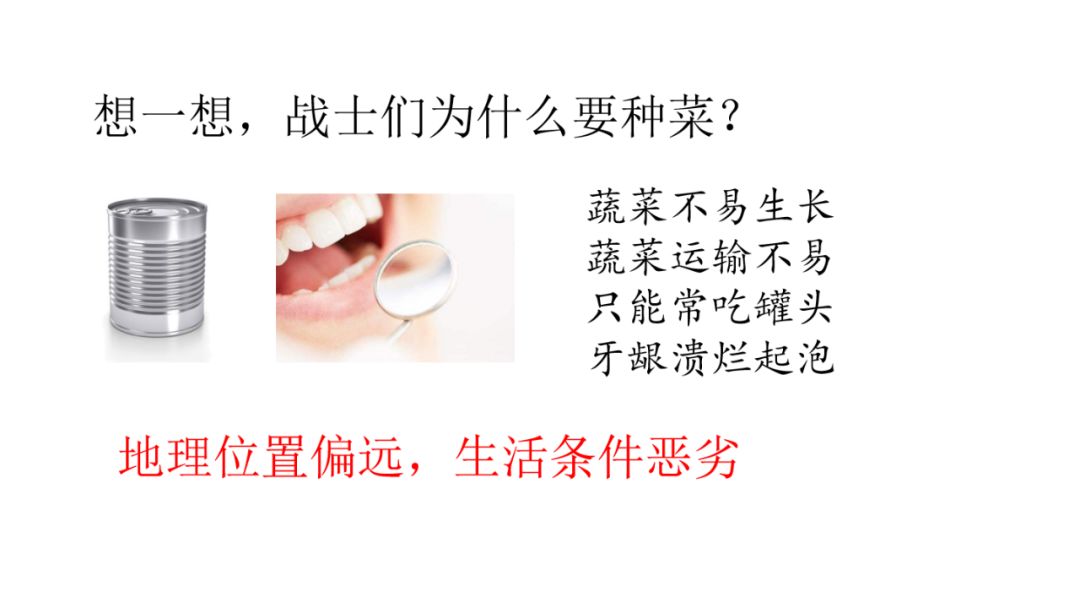 答:(1)菜地里的土,大部分是战士们从老家一口袋一口袋背来的。(2)菜种是战士们从老家带来的。(3)为了防晒和防盐,战士们用油布棚将菜地遮挡起来,并把菜地放在了小岛的南面。