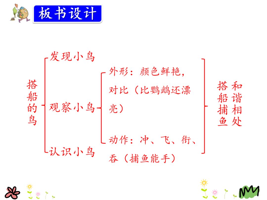 2.它一下子________进水里不见了。可是,没一会儿,它又________出来了,________的长嘴里衔着一条小鱼。它站在船头,一口把小鱼________了下去。
