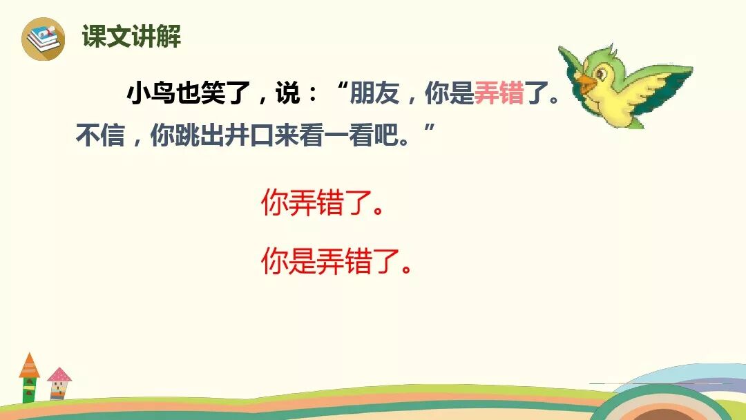 2.小鸟也笑了,说:“朋友,你是弄错了。不信,你跳出井来看看吧。”