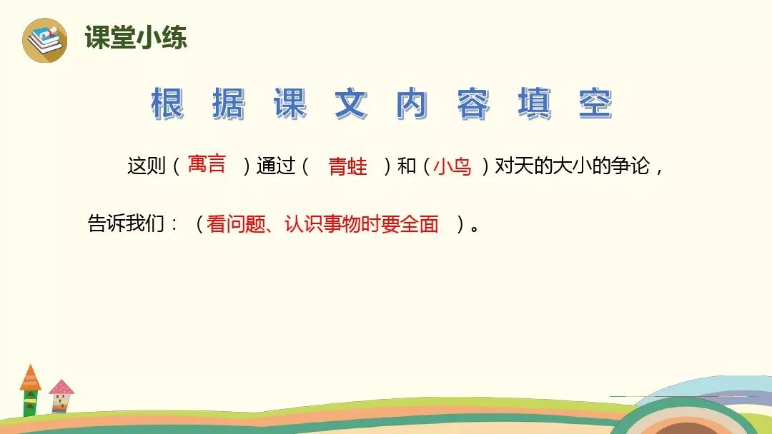 这则寓言通过青蛙和小鸟对天的大小的争论,说明了一个深刻的道理:看问题、认识事物,站得要高,看得要全面。不能像青蛙那样犯了错误还自以为是。