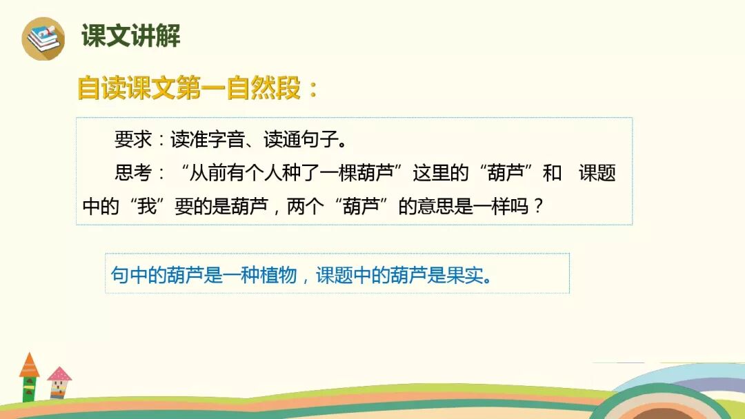 本文讲一个人种葫芦,不知道叶子和果实的关系,只盯着葫芦,不治叶子上的蚜虫,最后葫芦都落了。这篇课文告诉我们做事情要注意事物之间的联系。