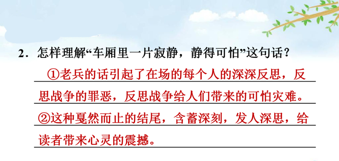 五、因为老兵的话引起了人们的深深反思,思考战争的罪恶,被战争的罪恶所震撼,深深感到战争带来的可怕灾难,这样结尾含蓄、发人深省。