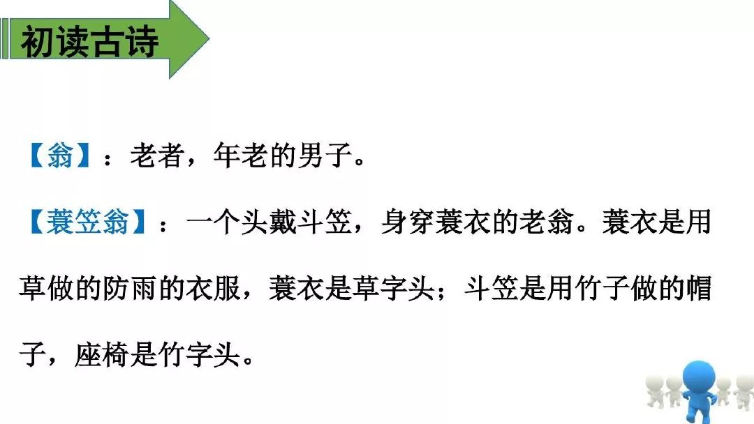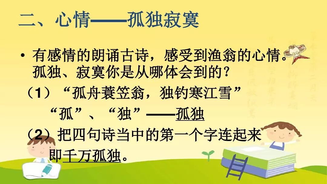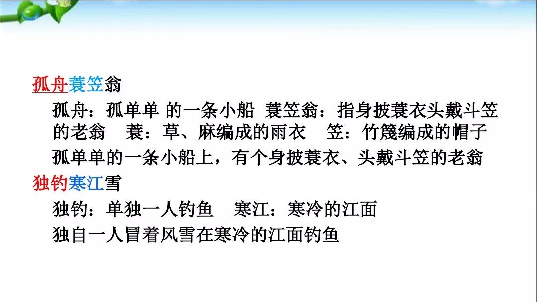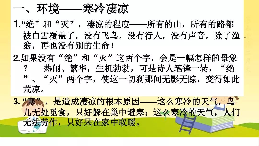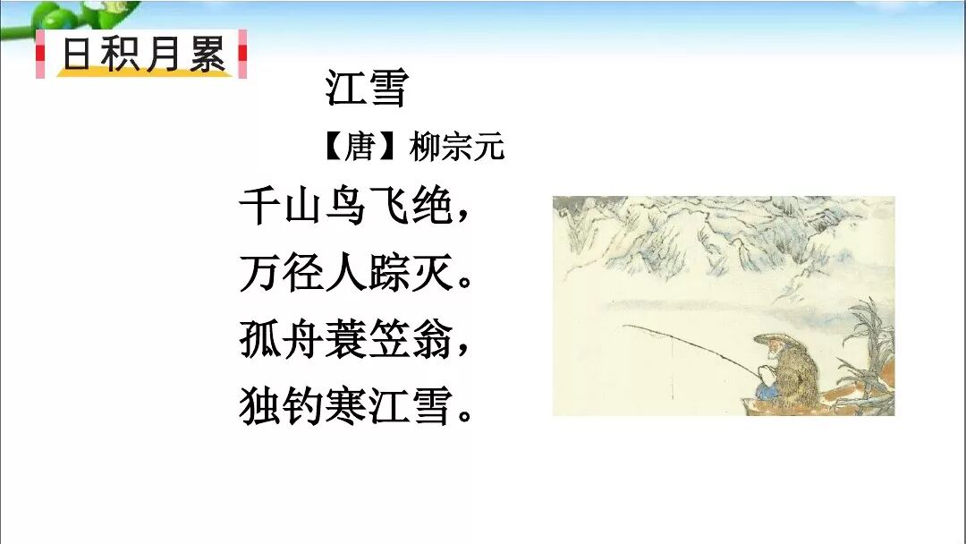诗意:所有的山,飞鸟全都断绝;所有的路,不见人影踪迹。江上孤舟,渔翁披蓑戴笠;独自垂钓,不怕冰雪侵袭。